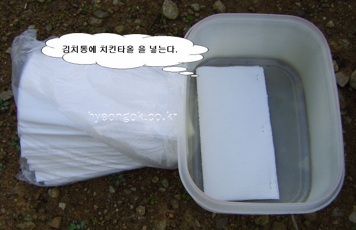 김치통에 미리 준비한 주방용 치킨타올 넣는다. 치킨 타올은 6장을 잘라 접은 뒤 호 집개로 약 세 군데 정도 짚어준다.
