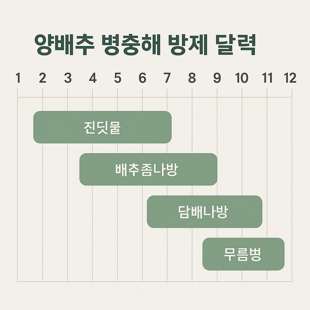 양배추는 특히 진딧물, 배추좀나방, 담배나방, 나방유충 등에 취약하므로, 유기농 방제나 천적 활용, 혹은 친환경 약제를 활용해 초기 방제를 철저히 해야 합니다.