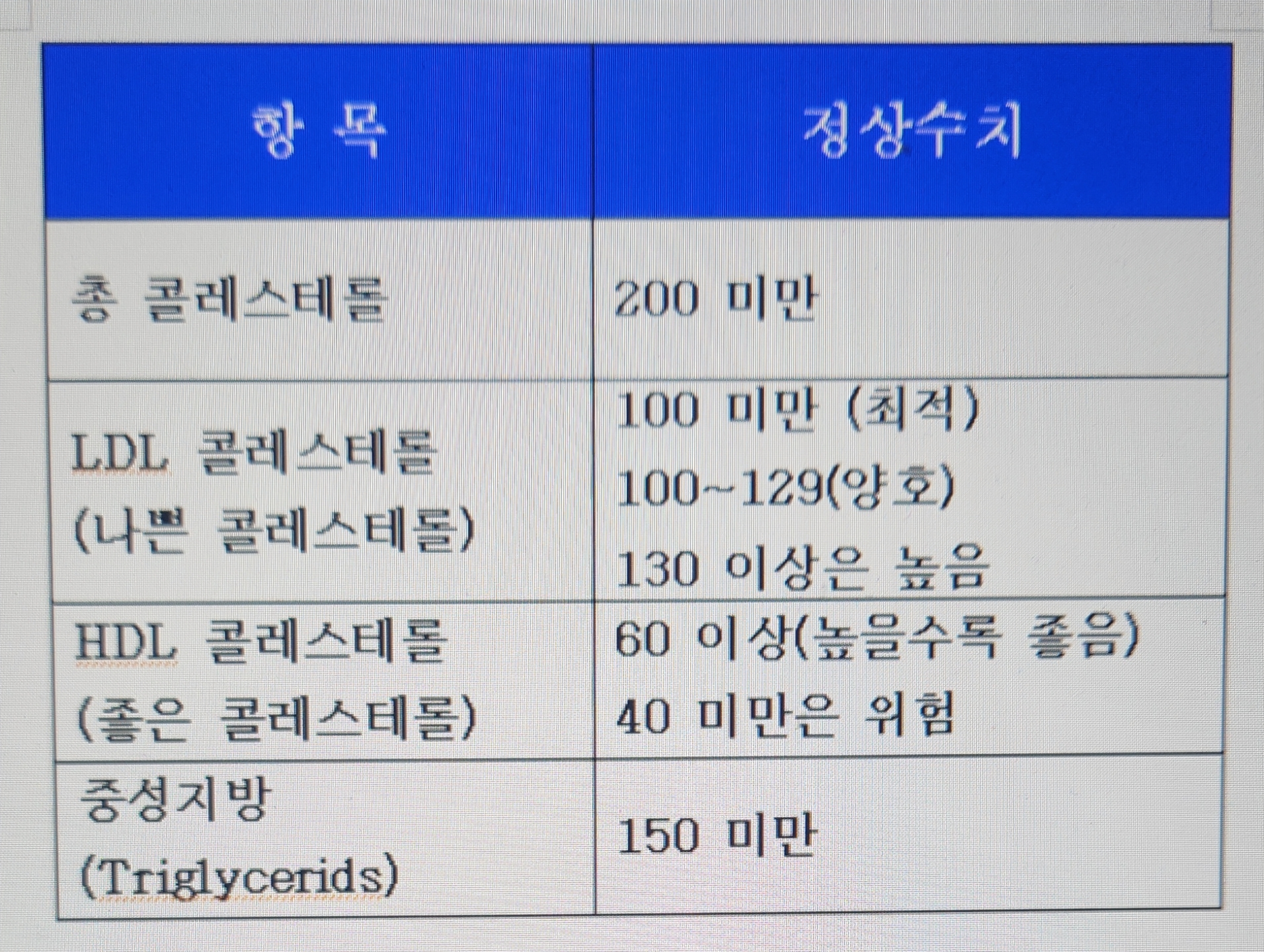 콜레스테롤 수치의 기준은?